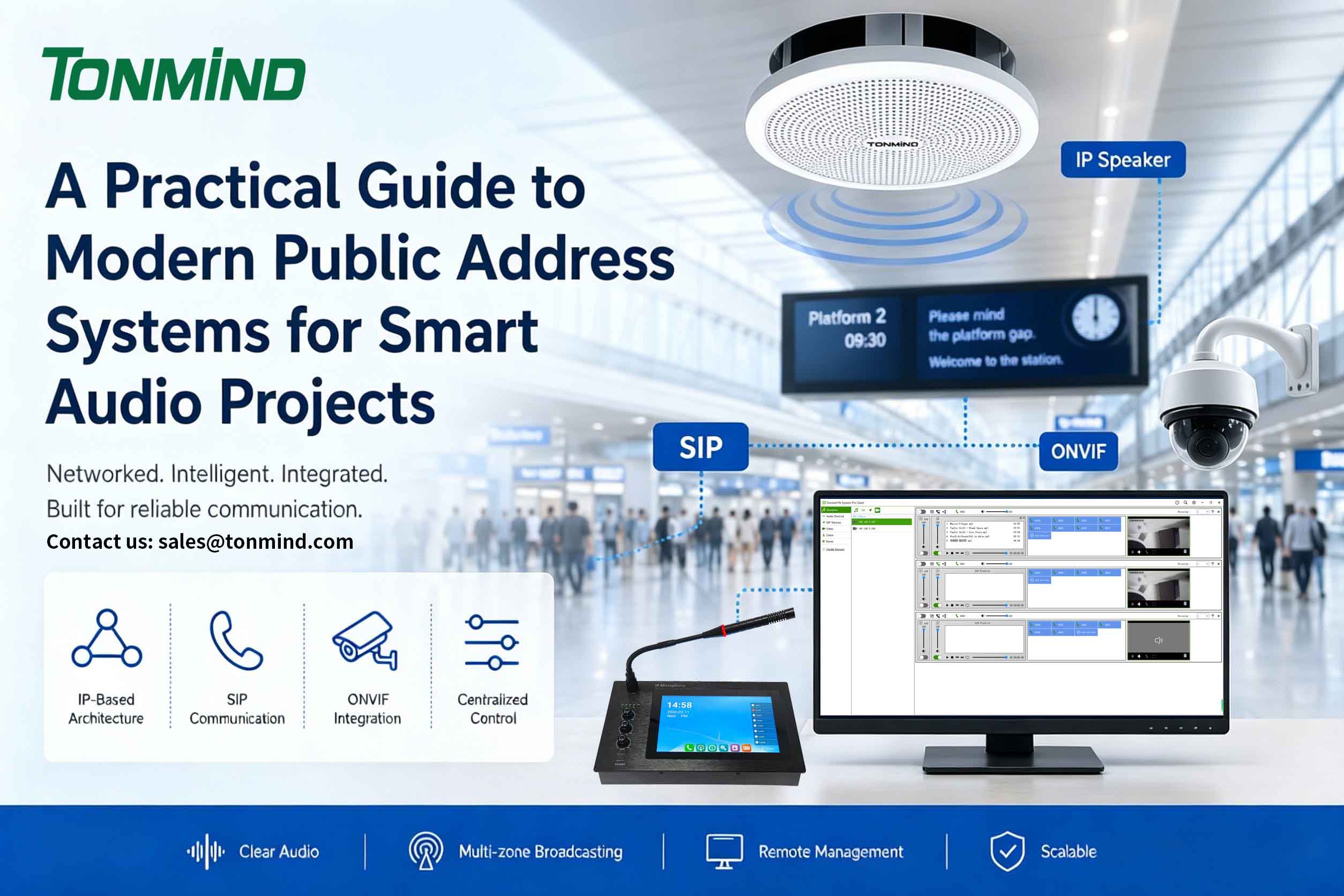 TONMIND focuses on delivering IP-based audio systems designed for scalability and interoperability. By leveraging technologies such as IP Speaker architecture, SIP communication protocols, and ONVIF integration, TONMIND solutions enable: